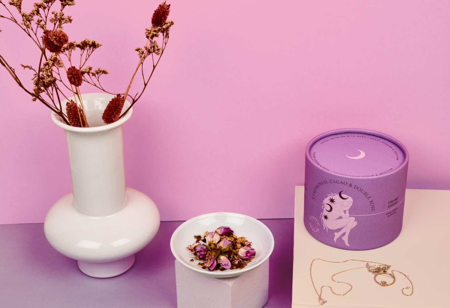 Ceremonial Cacao & Double Rose Infusion is a certified organic herbal tea designed to support relaxation and emotional balance.