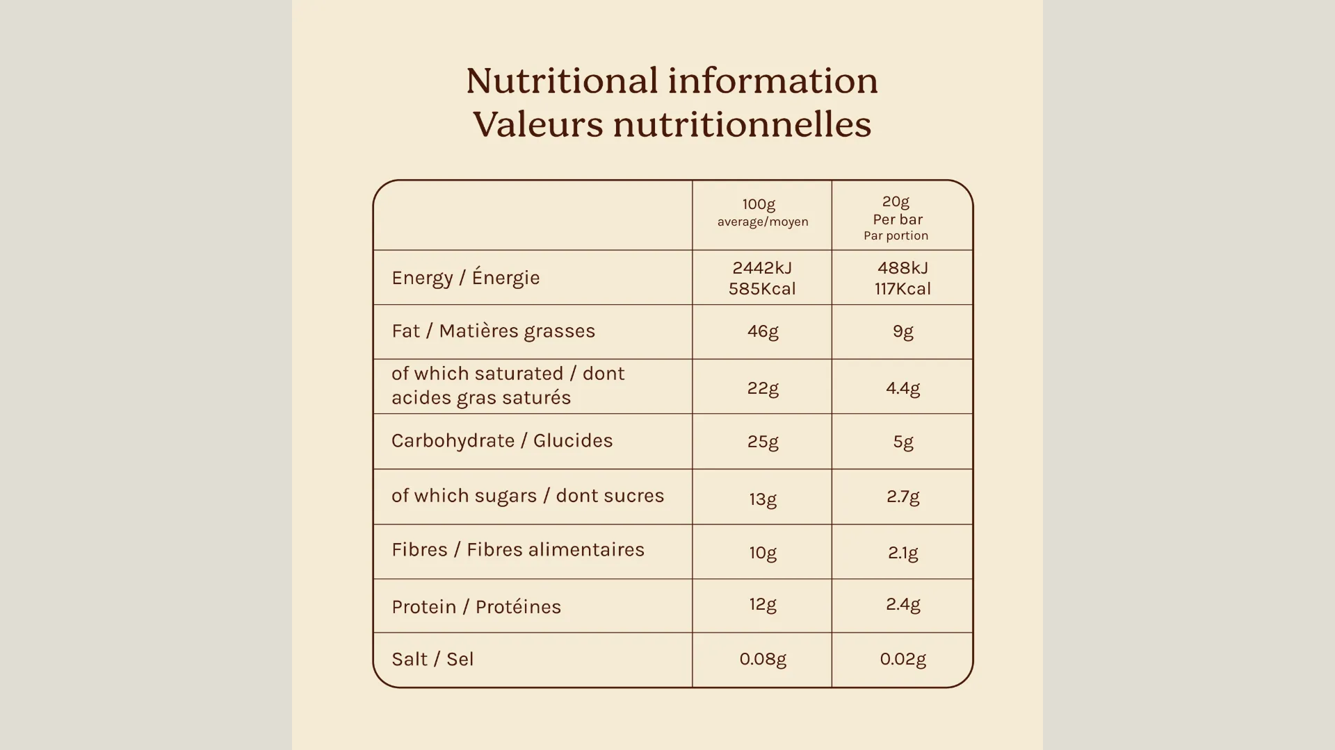 - Sweetened naturally with dates (2.7 g of sugar per chocolate)